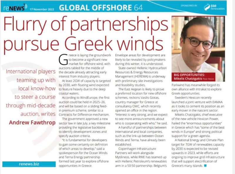 Συνέντευξη στο Βρετανικό περιοδικό ReNews έδωσε ο Μικέλης Χατζηγάκης, Διευθύνων Σύμβουλος της Σουηδικής Hexicon Power, σχετικά με τις προοπτικές των ανανεώσιμων πηγών ενέργειας στην Ελλάδα.