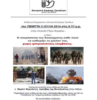 Η συνέντευξη αφορά την εκδήλωση που προγραμματίζεται για την Πέμπτη 3 Ιούλη 2014, στις 8:30 το απόγευμα, στην πλατεία Ρήγα Φεραίου και έχει ως θέμα: «την υπεράσπιση του δικαιώματος κάθε λαού να καθορίζει το μέλλον του, χωρίς ιμπεριαλιστικές επεμβάσεις».
