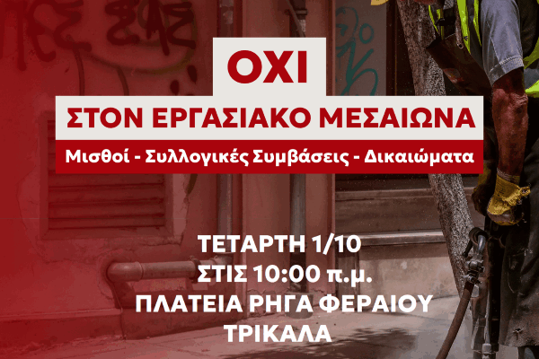 Για όλα αυτά, ο ΣΥΡΙΖΑ-ΠΣ Τρικάλων καλεί σε μαζική συμμετοχή στην απεργία στις 10 το πρωί της Τετάρτης 1 Οκτωβρίου στην Πλατεία Ρήγα Φεραίου, στα Τρίκαλα, προκειμένου να σταλθεί ισχυρό μήνυμα αντίθεσης του κόσμου της εργασίας στην ταξική πολιτική που υλοποιεί εις βάρος του η κυβέρνηση Μητσοτάκη.