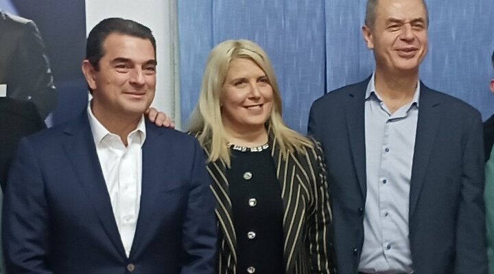 Η νέα Πρόεδρος της ΔΕΕΠ Τρικάλων έχει κάθε λόγο να χαμογελά, ανάμεσα στο Γραμματέα της ΝΔ Κώστα Σκρέκα και τον Γραμματέα Οργανωτικού του κόμματος Στέλιο Κονταδάκη, βλέποντας το όνειρο της να πραγματοποιείται και το κόμμα της να