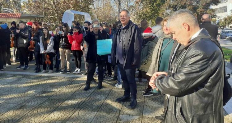 Μέσα σε ένα χριστουγεννιάτικο κλίμα, εκπαιδευτικοί και μαθητές συνάντησαν τον Αντιπεριφερειάρχη, όχι στο γραφείο του, αφού αυτό θα ήταν μικρό για να τους φιλοξενήσει, αλλά στην πλατεία Εθνικής Αντίστασης που βρίσκεται απέναντι από το κτίριο της Π.Ε. Τρικάλων, με το παρών να δίνει και ο περιφερειακός σύμβουλος Ντίνος Μπάρδας.
