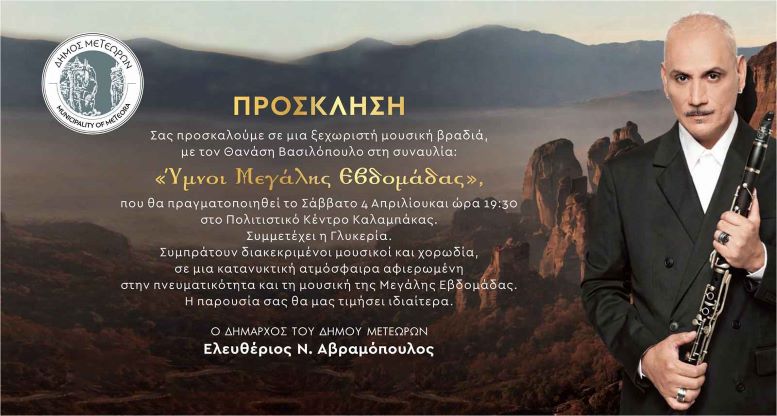 Ο Δήμος Μετεώρων προσκαλεί το κοινό σε μια ξεχωριστή μουσική βραδιά αφιερωμένη στο πνεύμα της Μεγάλης Εβδομάδας, το Σάββατο 4 Απριλίου και ώρα 19:30, στο Πολιτιστικό Κέντρο Καλαμπάκας. Στη συναυλία με τίτλο «Ύμνοι Μεγάλης Εβδομάδας», ο βιρτουόζος του κλαρίνου Θανάσης Βασιλόπουλος θα παρουσιάσει ένα κατανυκτικό πρόγραμμα με ύμνους και μελωδίες που αποτυπώνουν τη βαθιά συγκίνηση και τη μυσταγωγία των ημερών του Πάσχα.