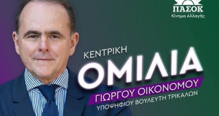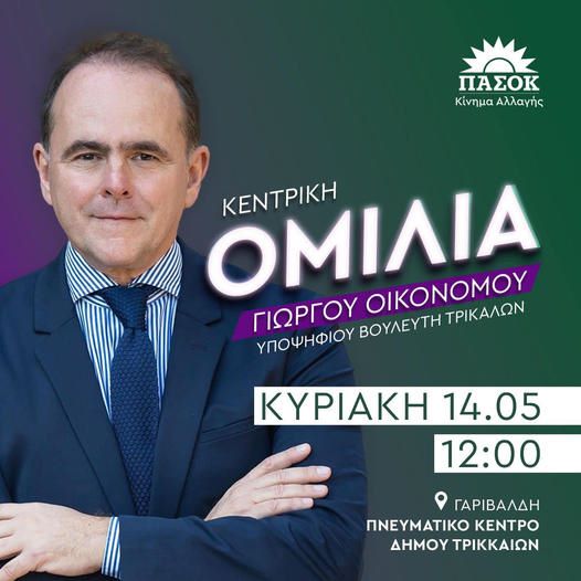 Την Προσεχή Κυριακή 14 Μαΐου θα πραγματοποιήσει την κεντρική πολιτική ομιλία στα Τρίκαλα, ο υποψήφιος Βουλευτής του ΠΑΣΟΚ-Κινήματος Αλλαγής Γιώργος Οικονόμου.