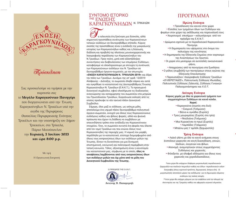 Την Κυριακή το Μεγάλο Καραγκούνικο Πανηγύρι στα Τρίκαλα 29/06/2023 Τοπικά - Θεσσαλικά Δημήτρης Παδιός Την ερχόμενη Κυριακή 2 Ιουλίου θα διεξαχθεί το Μεγάλο Καραγκούνικο Πανηγύρι από την Ένωση Καραγκούνηδων ν. Τρικάλων υπό την αιγίδα της Περιφερειακής Ενότητας Τρικάλων – Περιφέρεια Θεσσαλίας και την υποστήριξη του Δήμου Τρικκαίων. Το πρόγραμμα Ειδήσεις σήμερα Σωτ. Χατζηγάκης στην Εξεταστική Επιτροπή για ΟΠΕΚΕΠΕ: Δεν αντιμετωπίσαμε κανένα πρόβλημα κατά τη θητεία μου 03.02.2026 Επιτόπιες επισκέψεις σε έργα Σακκάς και Κουρέτας 03.02.2026 Ημέρα μνήμης για το Ολοκαύτωμα, στο Μουσείο Τσιτσάνη 03.02.2026 Δείτε όλες τις τελευταίες Ειδήσεις από την Ελλάδα και τον Κόσμο, τη στιγμή που συμβαίνουν, στο trikalain.gr