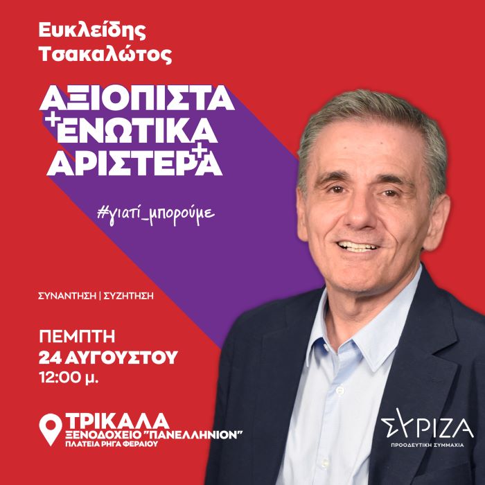 Την Πέμπτη 24 Αυγούστου, ο Ευ. Τσακαλώτος θα επισκεφθεί τα Τρίκαλα όπου θα παραχωρήσει συνέντευξη τύπου στο Ξενοδοχείο ΠΑΝΕΛΛΗΝΙΟΝ (Πλατεία Ρήγα Φεραίου) στις 11:30 π.μ..