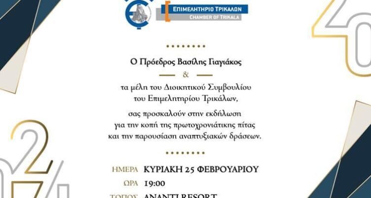 Την πίτα του κόβει την Κυριακή το Επιμελητήριο Τρικάλων 20/02/2024 Τοπικά - Θεσσαλικά Δημήτρης Παδιός Την πίτα του κόβει την Κυριακή 25 Φεβρουαρίου και ώρα 19:00 το Επιμελητήριο Τρικάλων Ειδήσεις σήμερα Ξαναπλημμύρισε ο οικισμός Τρίκκη- Στο ίδιο έργο θεατές! 01.02.2026 Στη Καστανιά του Δήμου Μετεώρων τα μέλη του Ορειβατικού Τμήματος της ΕΥΔΑΠ Αθηνών 01.02.2026 Συνεργασία Ντιντή -Πούλιου για την αντιμετώπιση της κακοκαιρίας 01.02.2026 Δείτε όλες τις τελευταίες Ειδήσεις από την Ελλάδα και τον Κόσμο, τη στιγμή που συμβαίνουν, στο trikalain.gr
