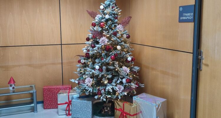 Έξω από την είσοδο του γραφείου του Δημάρχου και δίπλα από την αίθουσα του Δημοτικού συμβουλίου, ένα μεγάλο καλαίσθητο Χριστουγεννιάτικο δέντρο με τα απαραίτητα στολίδια και λαμπιόνια, στολίζει το επάνω όροφο του Δημαρχείου θυμίζοντας μας πως οι γιορτές των Χριστουγέννων είναι προ των πυλών!