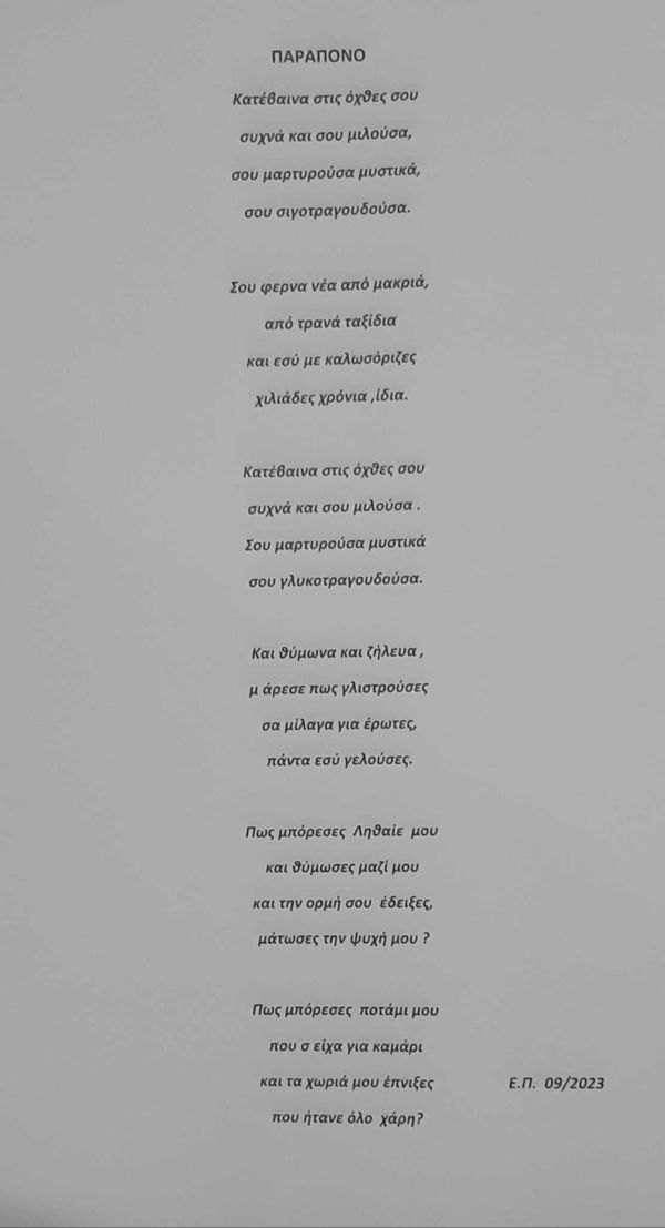 Με αφορμή τις πρόσφατες πλημμύρες που κατέκλυσαν την πόλη και τα χωριά των Τρικάλων προκαλώντας μεγάλες καταστροφές, η ευαίσθητη ψυχή της Έλενας Πλακώνα «όπλισε» το χέρι και την πένα της, γράφοντας ένα ποίημα για τον Ληθαίο ποταμό, το στολίδι των Τρικάλων.