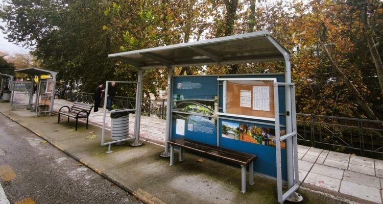 Τρεις στάσεις του Αστικού ΚΤΕΛ “ντύθηκαν” με προσεγμένες πληροφοριακές πινακίδες, που αποτυπώνουν ισάριθμα τοπόσημα της πόλης: Μουσείο Τσιτσάνη, Τζαμί, κεντρική πεζογέφυρα.