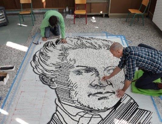 Οι δύο Τρικαλινοί καλλιτέχνες αποδεχόμενοι την πρόταση τουΣυλλόγου Γονέων και Κηδεμόνων του 5ου Δημοτικού σχολείου Τρικάλων, το οποίο μετονομάστηκε σε «Διονύσιος Σολωμός», κατασκευάζουν το ψηφιδωτό του ποιητή του Εθνικού μας ύμνου, με σκοπό όταν αυτό ολοκληρωθεί με το καλό, να κοσμήσει τους χώρους του σχολείου.
