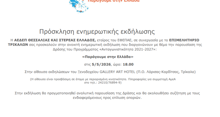 Η ΑΕΔΕΠ ΘΕΣΣΑΛΙΑΣ ΚΑΙ ΣΤΕΡΕΑΣ ΕΛΛΑΔΟΣ, εταίρος του ΕΦΕΠΑΕ σε συνεργασία με το Επιμελητήριο Τρικάλων διοργανώνουν την Τρίτη, 5/5/2026 και ώρα: 18.00 στο Ξενοδοχείο GALLERY ART HOTEL (Π.Ο. Λάρισας-Καρδίτσας, Τρίκαλα), Ανοικτή ενημερωτική εκδήλωση για την παρουσίαση της νέας Δράσης του Προγράμματος ΑΝΤΑΓΩΝΙΣΤΙΚΟΤΗΤΑ 2021-2027 «ΠΑΡΑΓΟΥΜΕ ΣΤΗΝ ΕΛΛΑΔΑ».