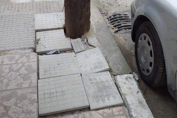 Η φωτογραφία από τα σπασμένα πλακάκια που προεξέχουν δίπλα από το στύλο της ΔΕΗ, είναι στη συμβολή των οδών Κορωνίδος και Στεργιοπούλου στα Τρίκαλα και μας την έστειλε αναγνώστης του trikalaIN.gr και κάτοικος της περιοχής.