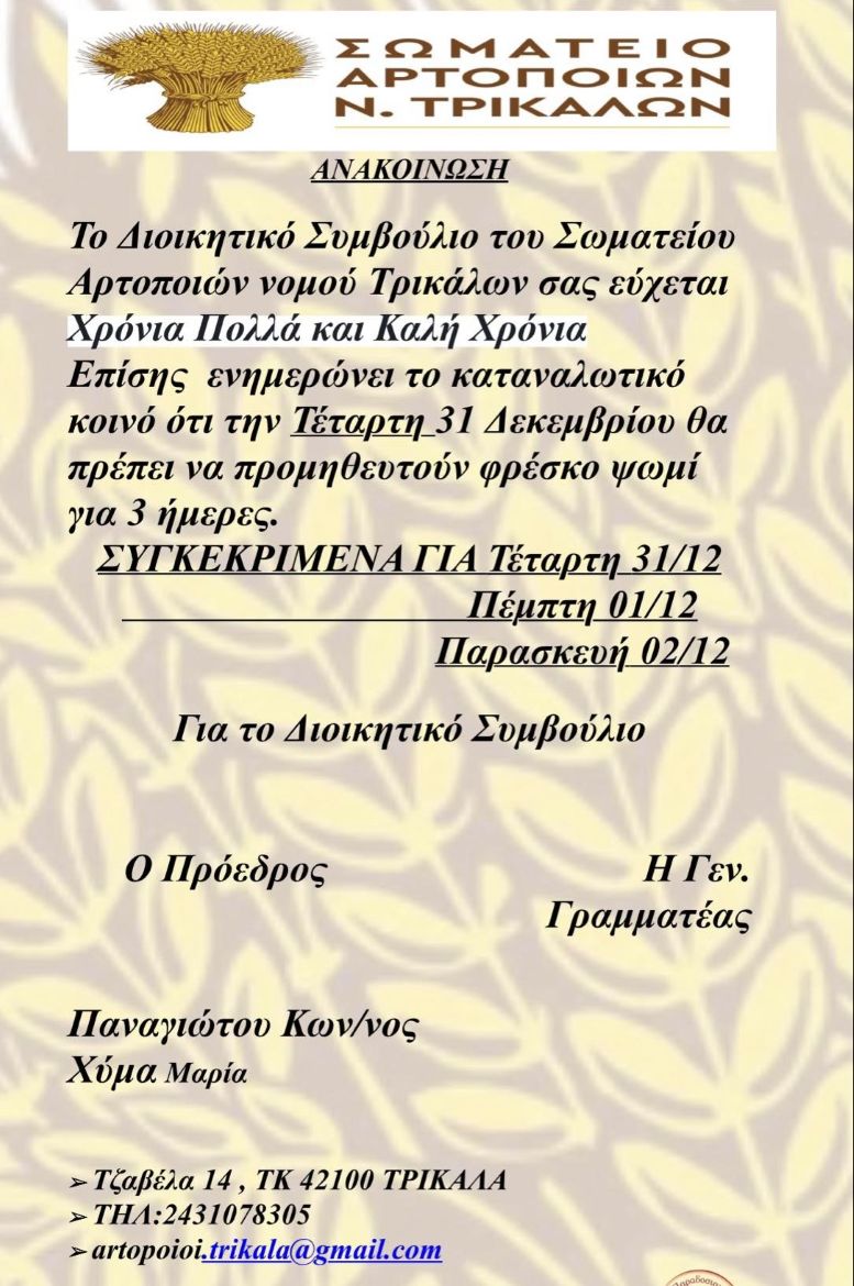 Τρίκαλα: Ψωμί για 3 ημέρες την Παραμονή Πρωτοχρονιάς 30/12/2025 Τοπικά - Θεσσαλικά Δημήτρης Παδιός Ψωμί για 3 ημέρες την Παραμονή Πρωτοχρονιάς από τα αρτοποιεία των Τρικάλων Ειδήσεις σήμερα Σαρώνουν γρίπη και εποχικές ιώσεις στα Τρίκαλα- Υπερπληρότητα στις παθολογικές κλινικές του Γενικού ΝοσοκομείουΕφυγε από τη ζωή η Δήμητρα ΜπέκουH Περιφέρεια Θεσσαλίας βράβευσε Εθελοντές Αιμοδότες Δείτε όλες τις τελευταίες Ειδήσεις από την Ελλάδα και τον Κόσμο, τη στιγμή που συμβαίνουν, στο trikalain.gr