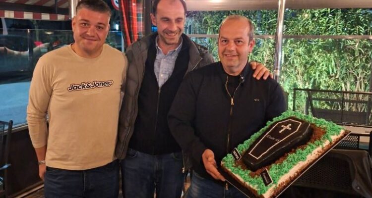 Και επειδή ο Πέτρος είναι της… δουλειάς, οι φίλοι και συνάδελφοι του του ευχήθηκαν τα χρόνια πολλά με μια τούρτα – φέρετρο!