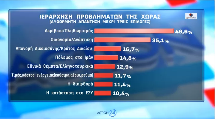 Η ακρίβεια/πληθωρισμός βρίσκεται σταθερά στην 1η θέση των προβλημάτων που απασχολούν τους πολίτες ΜΕ 49,6%, με τα θέματα της Οικονομίας/Ανάπτυξης να ακολουθούν με 35.1%. Ακολουθούν η απονομή δικαιοσύνης/ κράτος δικαίου με 16.7%, ο Πόλεμος στο Ιράν που εμφανίζεται στο 14.8%, τα Εθνικά θέματα/Ελληνοτουρκικά στο 12.9%, οι τιμές/κόστος ενέργειας στο 11.7%, η διαφθορά στο 11.4%, ενώ στην 8η πια θέση βρίσκεται η κατάσταση στο ΕΣΥ με 10.4 % σε συνεχή σταδιακή υποχώρηση.