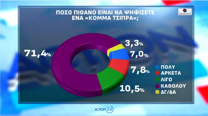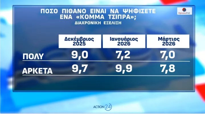 Το υπό ίδρυση κόμμα Τσίπρα εμφανίζει μείωση κατά 2.3% στη δυνητική ψήφο (πολύ και αρκετά πιθανό να το ψηφίσουν). Συγκεκριμένα, εμφανίζεται στο 14.8% (7% πολύ και 7.8% αρκετά), ενώ τον Ιανουάριο βρισκόταν στο 17.1% (7.2% πολύ και 9.9% αρκετά) και στο 18.7% τον Δεκέμβριο (9% και 9.7% αντίστοιχα).
