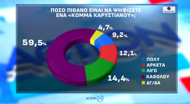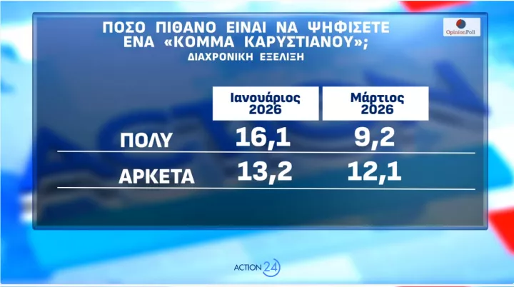 Το υπό ίδρυση κόμμα Καρυστιανού εμφανίζει σημαντική πτώση της τάξης του 8% στη δυνητική ψήφο. Εμφανίζεται στο 21.3% (9.2% πολύ και 12.1% αρκετά), ενώ τον Ιανουάριο βρισκόταν στο 29.3% (16.1% πολύ και 13.2% αρκετά). Έχει σημασία ότι η μεγάλη πτώση σημειώνεται σ΄ αυτούς που δήλωναν πολύ πιθανό να το ψηφίσουν. Υπάρχει 6.9% πτώση από το 8% που είναι η συνολική πτώση στο άθροισμα της δυνητικής ψήφου.