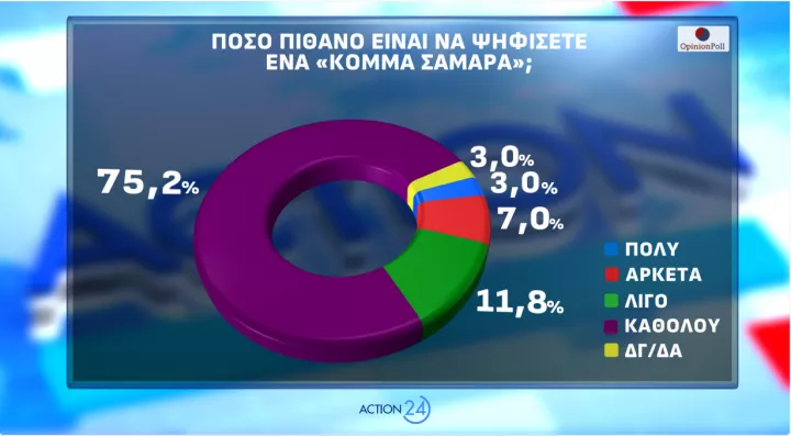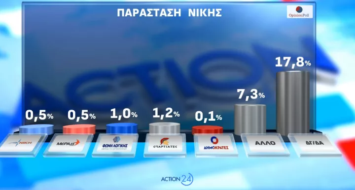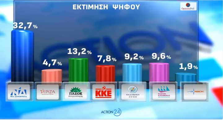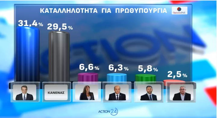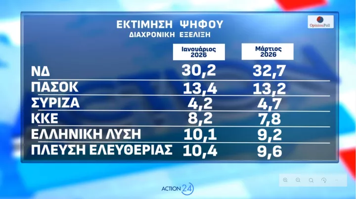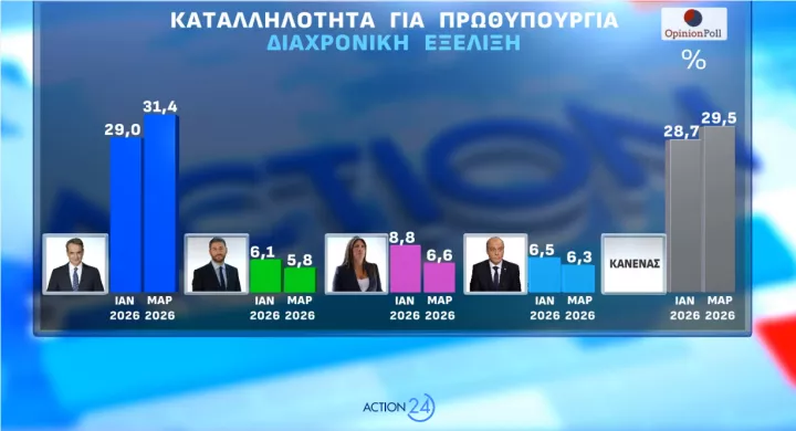 Ανατροπή των πολιτικών συσχετισμών καταγράφει νέα δημοσκόπηση της Opinion Poll για το Action 24, με φόντο τις κινήσεις της Ελλάδας στην Κύπρο και τη γεωπολιτική κρίση. Το 73,5% των πολιτών επιθυμεί σταθερότητα, ενώ η Νέα Δημοκρατία φτάνει το 33%, στην εκτίμηση ψήφου. Ο Κυριάκος Μητσοτάκης θεωρείται καταλληλότερος για πρωθυπουργός με 31,4%, και σχεδόν το 50% των ερωτηθέντων προτιμά αυτοδυναμία. Αντίθετα, Τσίπρας και Καρυστιανού εμφανίζουν σημαντική πτώση. Η δημοσκόπηση διεξήχθει αμέσως μετά την κήρυξη του πόλεμου στο Ιράν και στο διάστημα 04/03 και 06/03.