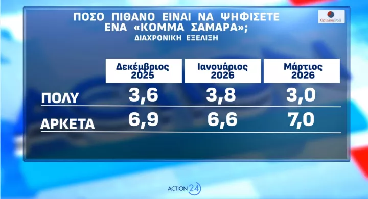 Το «κόμμα Σαμαρά» παρουσιάζει ουσιαστικά μια σταθερότητα με συνολική δυνητική ψήφο 10% (3% πολύ και 7% αρκετά). Τον Ιανουάριο ήταν στο 10.4% (3.8% πολύ και 6.6% αρκετά), ενώ τον Δεκέμβριο στο 10.5% (3.6% πολύ και 6.9% αρκετά).