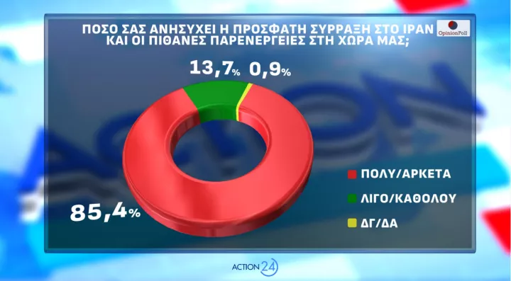 Το 85.4% δηλώνει ότι ανησυχεί πολύ και αρκετά (52% πολύ, 33.4% αρκετά) από τα διεθνή γεγονότα, τις γεωστρατηγικές αναταράξεις και τον πόλεμο στο Ιράν, όσον αφορά τις παρενέργειες και τα προβλήματα που μπορούν να εμφανιστούν στην περιοχή και τη χώρα μας. Το 13.7% δηλώνει ότι ανησυχεί λίγο ή καθόλου (9.6% λίγο, 4.1% καθόλου).