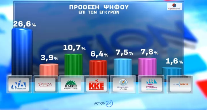 Στην πρόθεση ψήφου επί των εγκύρων οι αντίστοιχες επιδόσεις είναι: ΝΔ 26.6%, ΠΑΣΟΚ 10.7%, ΠΛΕΥΣΗ ΕΛΕΥΘΕΡΙΑΣ 7.8%, ΕΛΛΗΝΙΚΗ ΛΥΣΗ 7.5%, Κ.Κ.Ε 6.4%, ΦΩΝΗ ΛΟΓΙΚΗΣ 4%, ΣΥΡΙΖΑ 3.9%, ΜΕΡΑ 25 2.4%, ΝΙΚΗ 1.6%, ΔΗΜΟΚΡΑΤΕΣ – ΠΡΟΟΔΕΥΤΙΚΟ ΚΕΝΤΡΟ 1.4%, ΣΠΑΡΤΙΑΤΕΣ 1.3%, ΝΕΑ ΑΡΙΣΤΕΡΑ 0.8%, με το ΑΛΛΟ ΚΟΜΜΑ στο 7.2% και τους Αναποφάσιστους στο 18.6%. Σημειώνεται, ότι από την απλή πρόθεση ψήφου με όλες τις απαντήσεις το λευκό/άκυρο/αποχή βρίσκεται στο 4.1% και οι αναποφάσιστοι στο 17.8%. Το σύνολο δηλαδή της « γκρίζας ζώνης» είναι 21.9% από 24.4% τον Ιανουάριο.
