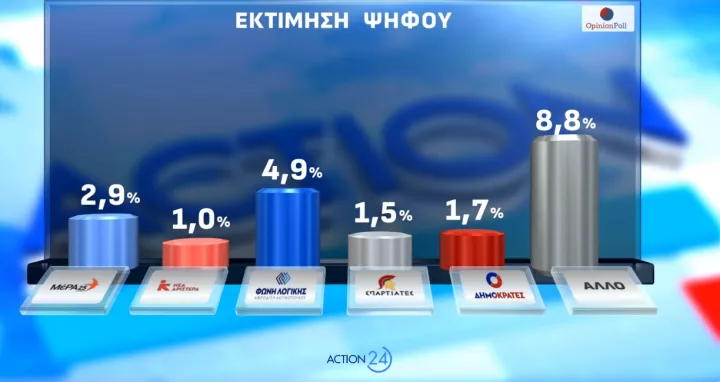 Το ΠΑΣΟΚ βρίσκεται στο 13.2% από το 13.4% τον Ιανουάριο. Ακολουθούν η ΠΛΕΥΣΗ ΕΛΕΥΘΕΡΙΑΣ με 9.6% (10.4%), η ΕΛΛΗΝΙΚΗ ΛΥΣΗ με 9.2% (10.1%), το Κ.Κ.Ε με 7.8% (8.2%), η ΦΩΝΗ ΛΟΓΙΚΗΣ με 4.9% (4.2%), ο ΣΥΡΙΖΑ με 4.7% (4.2%), το ΜΕΡΑ 25% με 2.9% (2.4%), η ΝΙΚΗ με 1.9% (2.1%), οι ΔΗΜΟΚΡΑΤΕΣ – ΠΡΟΟΔΕΥΤΙΚΟ ΚΕΝΤΡΟ με 1.7% (1.5%), οι ΣΠΑΡΤΙΑΤΕΣ με 1.5% (1.1%) και η ΝΕΑ ΑΡΙΣΤΕΡΑ με 1% (1.2%), ενώ το ΑΛΛΟ ΚΟΜΜΑ βρίσκεται στο 8.8% (11.1%).
