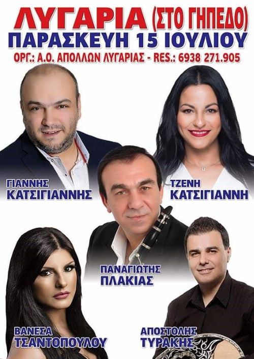Την Παρασκευή 15 Ιουλίου στο γήπεδο της Λυγαριάς, διασκεδάστε με τον Γιάννη και Τζένη Κατσίγιαννη στο τραγούδι, τον Παναγιώτη Πλακιά στο κλαρίνο, την Βανέσσα Τσαντοπούλου στο τραγούδι και τον Αποστόλη Τυράκη στο μπουζούκι.
