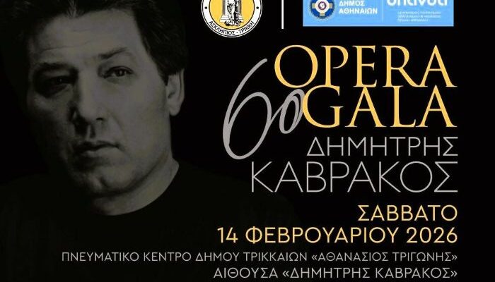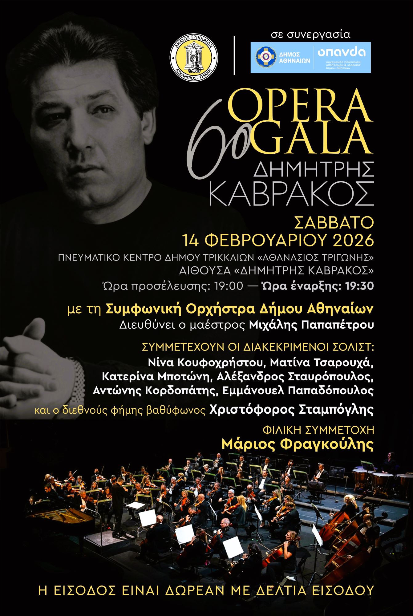 Tο 6ο Opera Gala «Δημήτρης Καβράκος» διοργανώνεται από τον Δήμο Τρικκαίων σε συνεργασία με τον Οργανισμό Πολιτισμού, Αθλητισμού και Νεολαίας Δήμου Αθηναίων (ΟΠΑΝΔΑ). Θα πραγματοποιηθεί το Σάββατο 14 Φεβρουαρίου 2026, στις 7.30 το απόγευμα, στην κεντρική αίθουσα του Πνευματικού Κέντρου Δήμου Τρικκαίων «Αθανάσιος Τριγώνης», η οποία φέρει το όνομα «Δημήτρης Καβράκος».