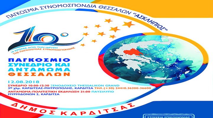 Ξεκίνησε και …μετρά αντίστροφα ο χρόνος για την έναρξη του «10ου Παγκόσμιου Συνεδρίου Θεσσαλών» που θα πραγματοποιηθεί φέτος στην Καρδίτσα, την Κυριακή 12 Αυγούστου 2018, από την Παγκόσμια Συνομοσπονδία Θεσσαλών «ΑΣΚΛΗΠΙΟΣ», με την πολύτιμη συνδρομή του Δήμου Καρδίτσας. Η φετινή καθιερωμένη ετήσια ουσιαστικά συνάντηση των Θεσσαλών, από πόλεις και χώρες που χτυπά η καρδιά της Θεσσαλίας και της Ελλάδας από ολόκληρο τον κόσμο, σηματοδοτεί κάτι το ξεχωριστό, καθώς συμπληρώνεται ήδη μια πρώτη δεκαετία όχι μόνο δυνατών συγκινήσεων, αλλά ουσιαστικών παρεμβάσεων, δράσεων, ενεργειών και προτάσεων, που χρόνο με το χρόνο, λαμβάνουν σάρκα και οστά και υλοποιούνται. Πρόκειται για την πρώτη δεκαετία, που φέτος ειδικά, τιμώντας την δεκάχρονη πορεία, θα είναι γεμάτη με χρώματα, αρώματα, γεύσεις, ήχους, λόγους, χορούς και εικόνες που αποπνέουν τη … μοναδική Θεσσαλία.