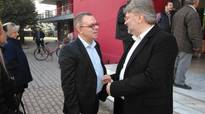 Στο φωτογραφικό στιγμιότυπο του trikalaIN, υποδέχεται τον γνωστό δημοσιογράφο Μανώλη Κοττάκη στην είσοδο του Πνευματικού Κέντρου Τρικάλων, κατά την πρόσφατη παρουσίαση του βιβλίου του Μικέλη Χατζηγάκη.
