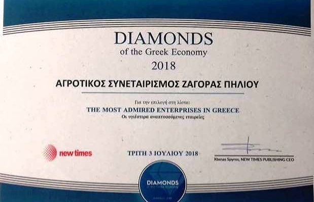 Ο Συνεταιρισμός βρέθηκε μεταξύ των 3000 ελληνικών επιχειρήσεων που διακρίθηκαν ως επαρκείς προς αξιολόγηση και τελικά επιλέχθηκε ανάμεσα στις περίπου 600 ελληνικές επιχειρήσεις που κατατάχθηκαν στα “Διαμάντια της Ελληνικής Οικονομίας” από την εταιρεία New Times Publishing. Ενδεικτικά αναφέρεται ότι σύμφωνα με τα στοιχεία της Ελληνικής Στατιστικής Αρχής του 2015, το σύνολο των επιχειρήσεων στην Ελλάδα, ανέρχεται περίπου στο 1.000.000.