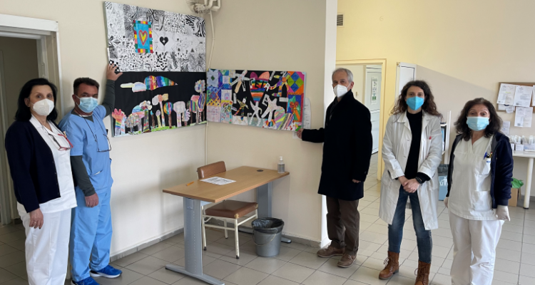 Μια όμορφη εικόνα έχει δημιουργηθεί στο Εμβολιαστικό Κέντρο Παίδων του Γενικού Νοσοκομείου Τρικάλων με τις ζωγραφιές που κατασκεύασαν μαθητές και εκπαιδευτικοί του 5ου Δημοτικού Σχολείου Τρικάλων ¨ΔΙΟΝΥΣΙΟΣ ΣΟΛΩΜΟΣ¨ και χάρισαν στο Νοσοκομείο.